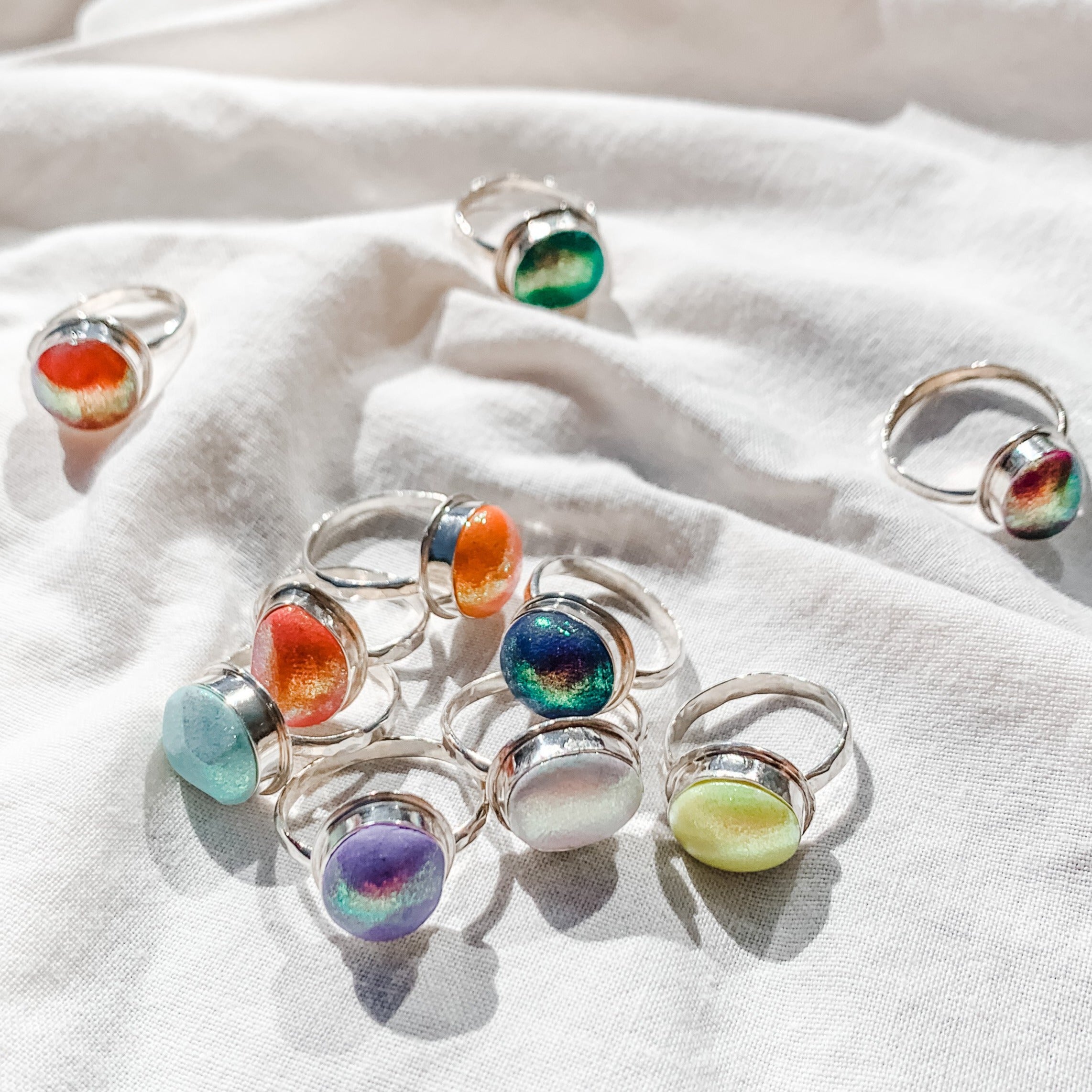Delicious pops of color, these happy rings are hand crafted by the artist. Hammered sterling silver bezel accented with bright bursts of colored clay, each ring will be unique.